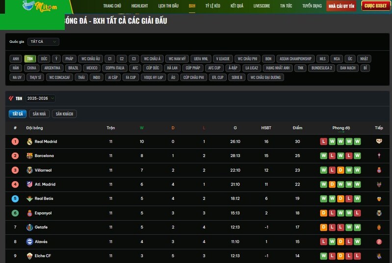 Dữ liệu phong độ – xem BXH là hiểu luôn lý do