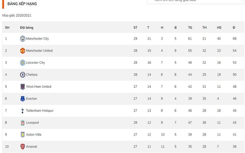 Bảng xếp hạng đầy đủ – chuẩn từng chi tiết