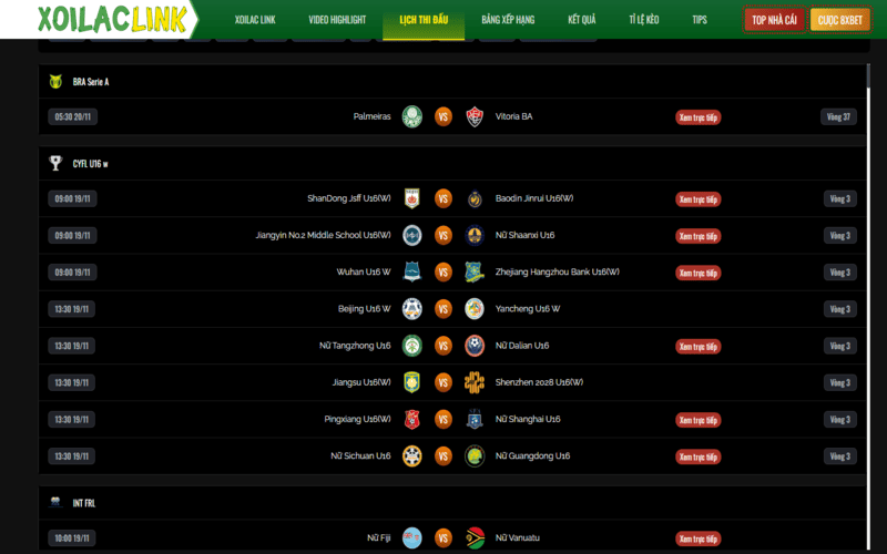 Ngay tại trang chính, lịch thi đấu và trận đang phát sóng hiển thị rõ ràng. Người xem có thể dùng thanh tìm kiếm hoặc chọn trực tiếp theo khung giờ để tìm trận mong muốn.